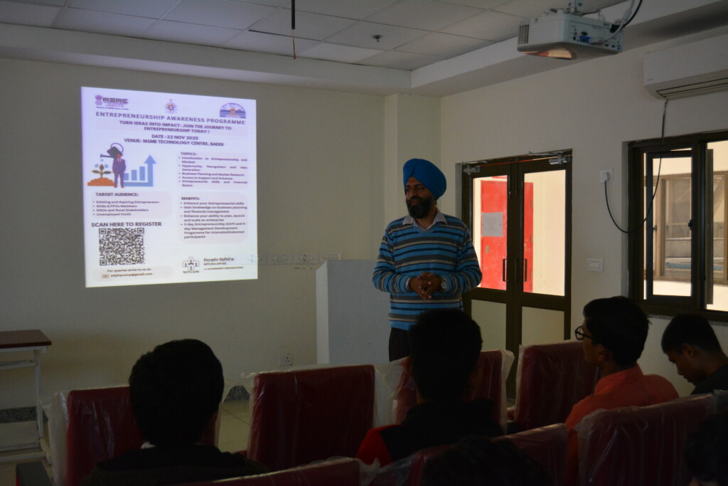 With the support of the Department of Industries and the Himachal Pradesh Government, an Entrepreneurship Awareness Session was successfully conducted at the MSME Technology Centre, Baddi. The initiative aimed to inspire students to explore entrepreneurship and understand the fundamentals of starting and sustaining a business.